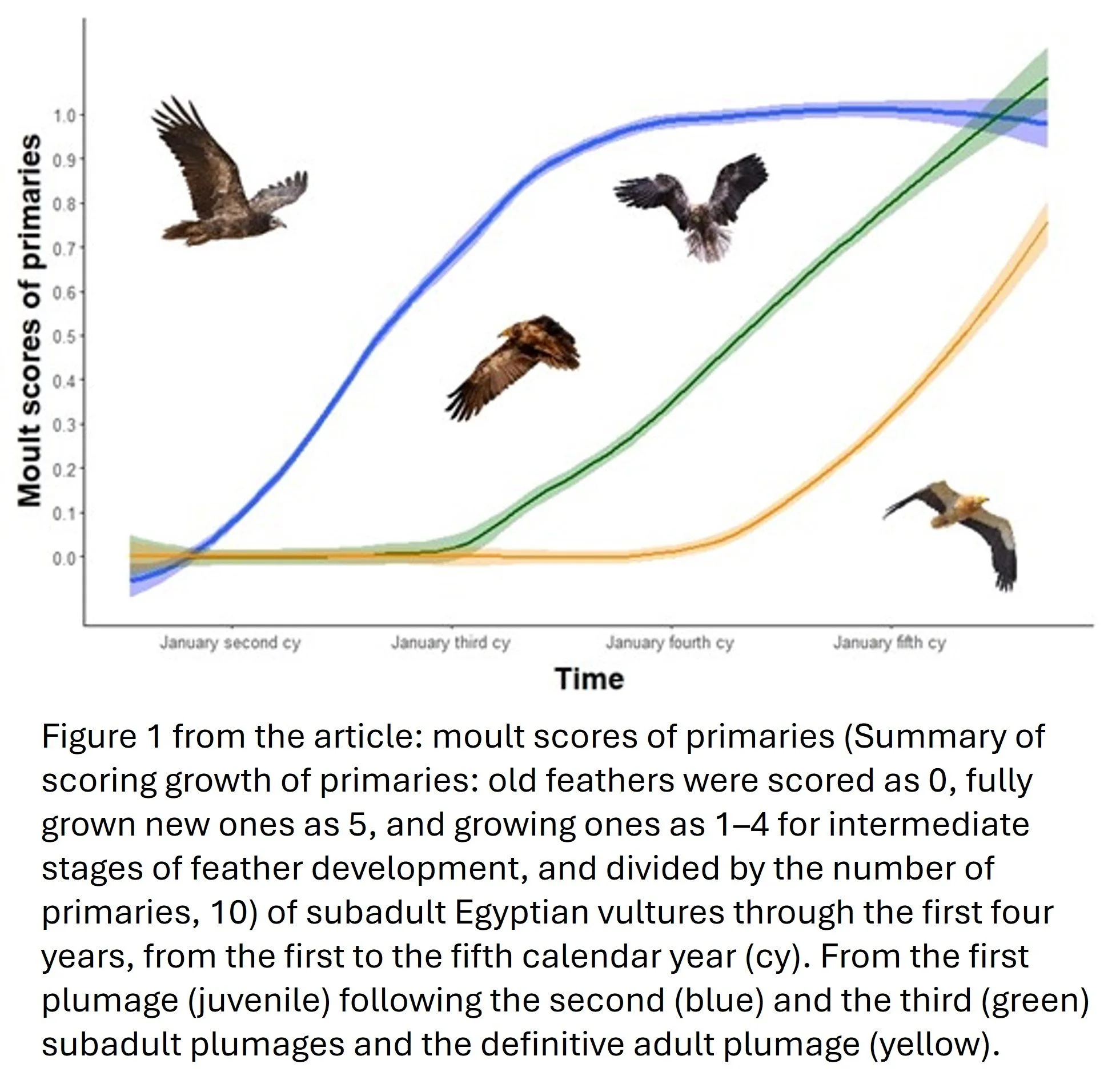 Even more strikingly, subadult Egyptian Vultures continue moulting during both autumn and spring migrations. To our knowledge, this makes them unique among raptors: they maintain an almost continuous moult during their early life, including during long migratory journeys.