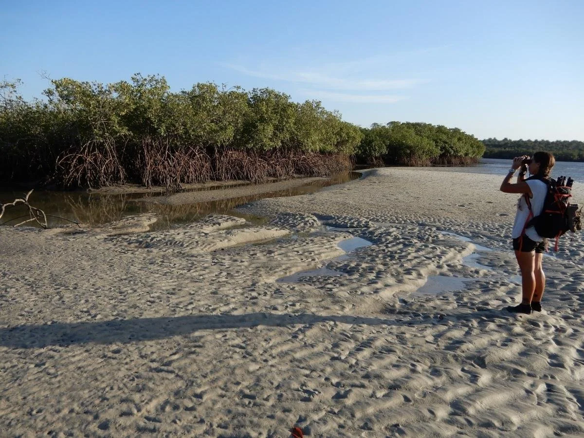 First author Ana Coelho looking into a gully in the mangroves that mark the transition between open mud- and sandflats and the higher land of the Bijagós islands in many places.